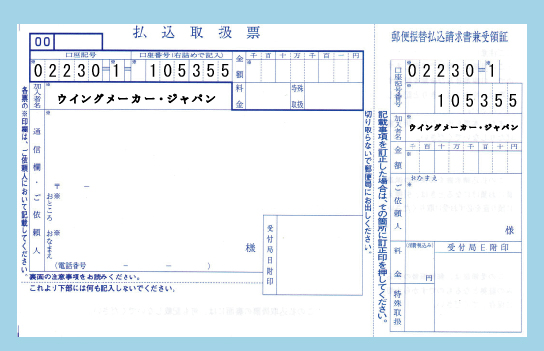 銀行名:ゆうちょ銀行 店番:229 預金種目:当座 店名:二二九 店(ニニキユウ店) 口座番号:0105355 受取人:ウイングメーカー ジャパン